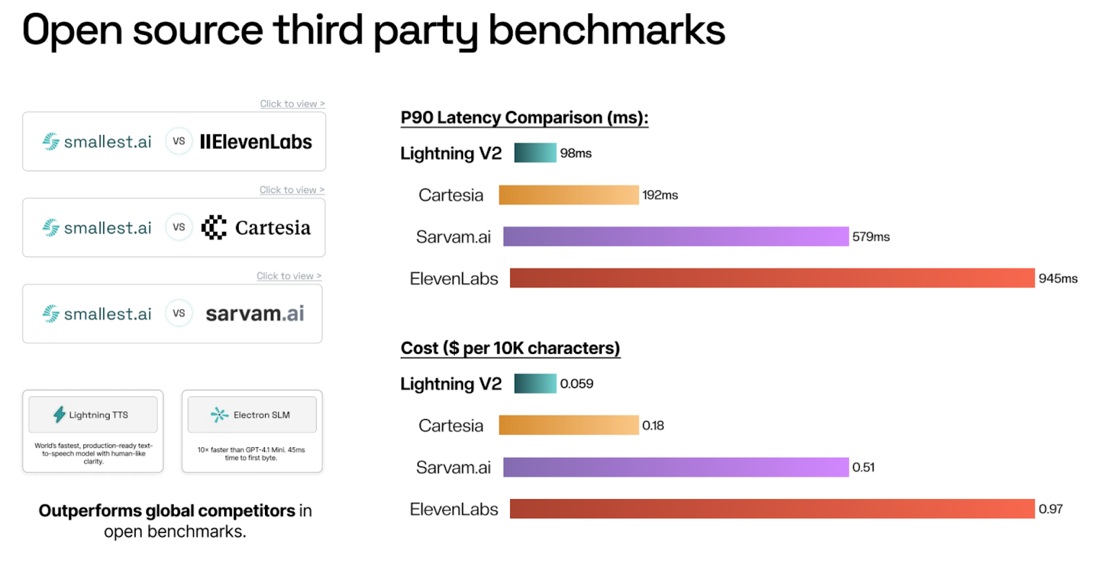 - Industry-leading performance: The company has some of the fastest, highest-quality voice AI models in the world (Lightning Text to Speech) that outperform Elevenlabs and Cartesia across all parameters. Their SLM Electron outperforms GPT 4.1 Mini in both quality and latency for real-time conversational use cases. Smallest AI delivers great performance through proprietary models, including: